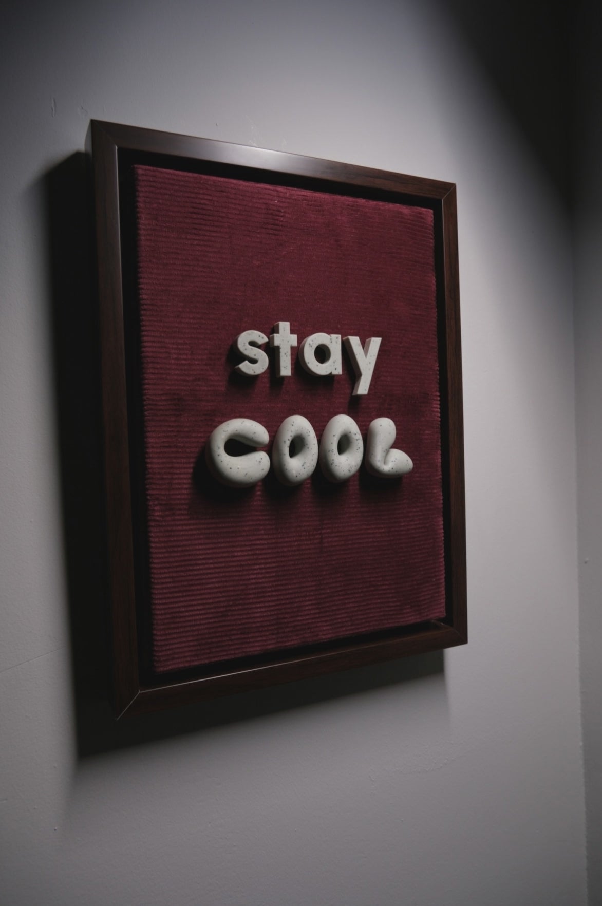 Stay Cool is a handmade 3D typography mural designed for modern living spaces, conveying a calm yet powerful message.