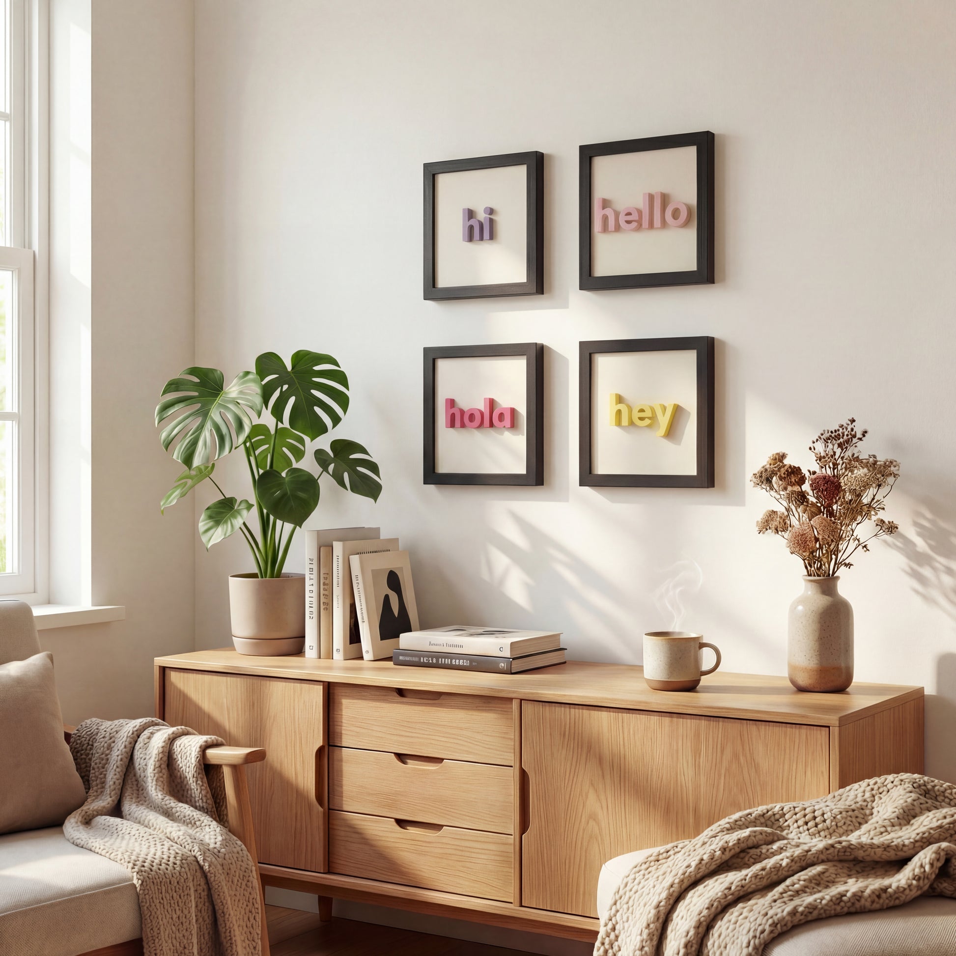Bu 4’lü tablo seti, hello, hey, hi ve hola kelimelerinden oluşan dört adet tablodan oluşur ve her bir tablo 20 × 20 cm ölçülerindedir. Harfler, tabloya derinlik kazandıran üç boyutlu epoksi reçine malzemeden üretilmiştir. Harf Derinliği 1cm dir. Hafif yapılı polistiren çerçeve ile tamamlanan tablolar, arka kısım 0.4cm mdf üzerine boya yapılarak üretilir. El işçiliğiyle üretilen bu set, modern ve minimalist tasarımı sayesinde antre, salon, ofis, kafe ve yaratıcı alanlar için dekoratif ve dikkat çekici bir duvar aksesuarıdır. Hafif yapısı sayesinde kolayca asılabilir ve yaşam alanlarına enerjik bir dokunuş katar.